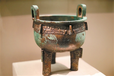 在此次展出的青銅器中,有一部分是僅銘有族氏銘文的,即家族的名號,以表示是該物品的所屬人。代表族徽的銘文,象形的程度會比較高,主要用作禮器。比如展出的鳥父甲鼎,內(nèi)里的銘文就是自上而下三個字,其中“鳥”字則幾乎完全是鳥的象形,這個鳥就是鳥族的族徽,鳥族族群在當時十分龐大。而后面兩個字就是“日名”,日名是指古人對逝人的稱謂,一般以甲乙丙丁戊己庚辛壬癸十天干前加上受祭者的輩分格式出現(xiàn)。這種禮器又叫做日名器,既點明了受祭者,又表明了作器者和受祭者的關(guān)系。