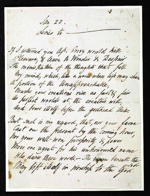 ▲珀西·比?!ぱ┤R的《致拜倫的十四行詩(shī)》草稿。