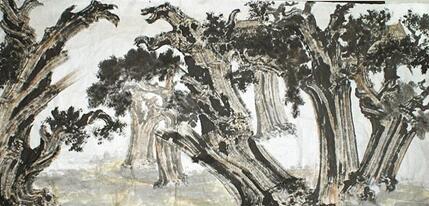 另一個他擅長的題材是古柏樹。1992年他去泰山采風(fēng)途中。山上的古柏樹生機(jī)勃發(fā),堅韌不拔,給他帶來了一種震撼的力量。他當(dāng)時就想將這些古柏入畫,為古柏注入精神意義。從此,在孔府、孔林、古蜀道以及陜西等地都留下他觀察古柏的足跡。有評論家認(rèn)為,他的藝術(shù)作品不但在整體的構(gòu)圖上自然、清新和潤朗。而且在整體的布局上,疏密相間,虛實相融,用獨有藝術(shù)感覺構(gòu)建出了一個既蘊含了詩情畫意,又張揚了文化魅力和內(nèi)心情感的藝術(shù)空間。
