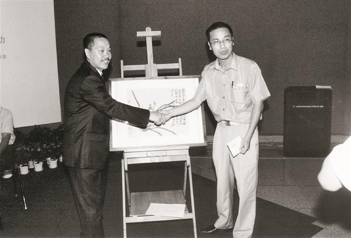 2005年7月,陳湘波(左)出席“情系災(zāi)區(qū)奉獻愛心——深圳市文化系統(tǒng)書畫作品賑災(zāi)義賣活動”。