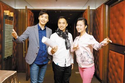 更新版《百花亭贈劍》的編劇江駿杰(中)與男女主角王志良(左)、林穎施(右)