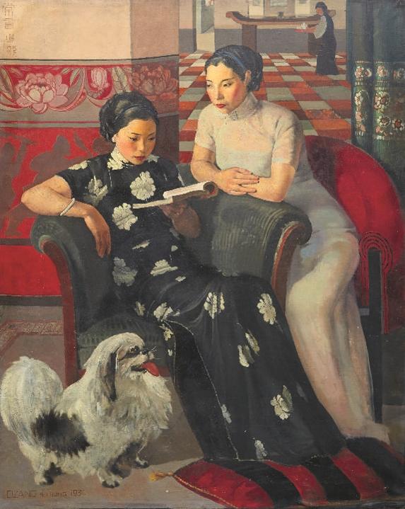 《客廳中的姐妹》畫(huà)面鮮艷,人物明媚,藝術(shù)家是以妻子為模特,描繪出她在家中客廳讀書(shū)的美態(tài)。據(jù)紅梅教授介紹,畫(huà)中兩姐妹的形象,實(shí)為常書(shū)鴻妻子陳芝秀一人,只是她穿著不同衣服入畫(huà)。精于學(xué)院派古典主義繪畫(huà)技法的藝術(shù)家,在純熟的技巧中飽蘸深情,把妻子?jì)寡诺娜粘C璁?huà)得美哉悠哉。中式美人倚坐西式油畫(huà)中,東西雜糅,搖曳生姿。