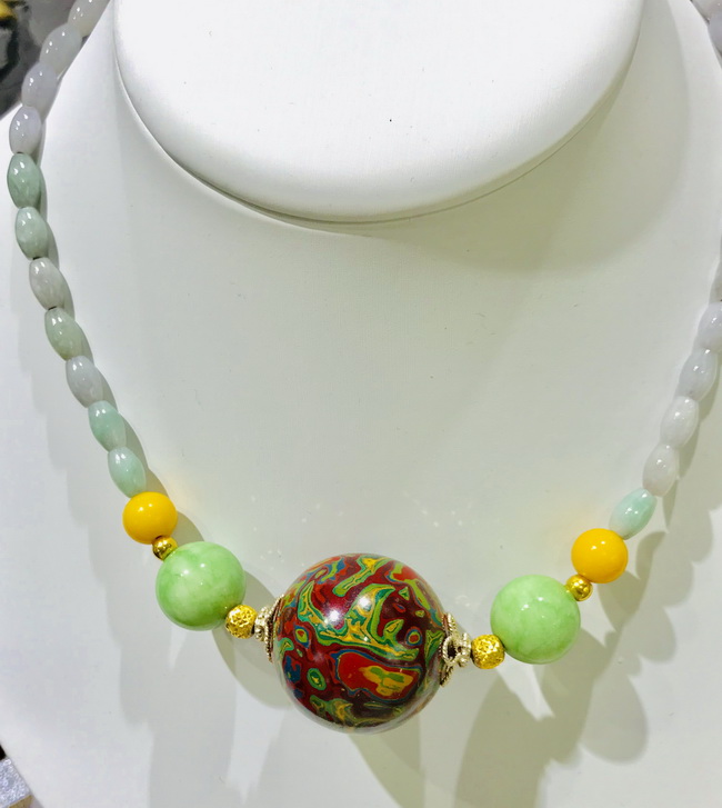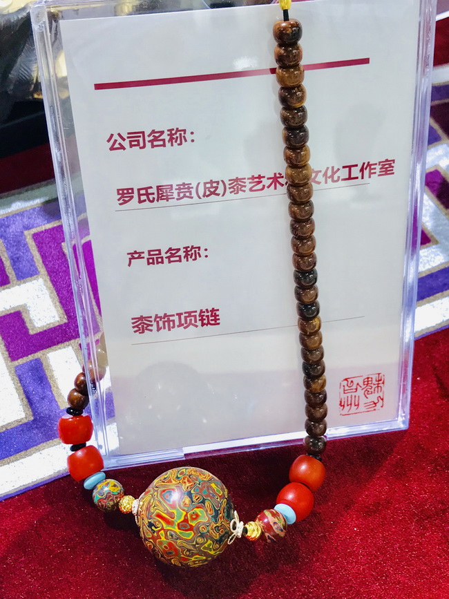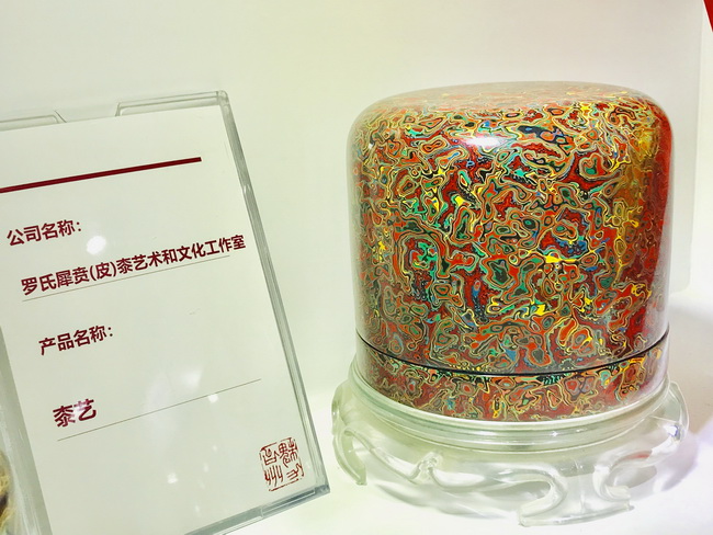 浙江省組團(tuán)的展位在會(huì)展中心2號(hào)館,規(guī)模不小,羅獻(xiàn)兵老師的漆藝作品都比較精致,但展位卻比較舒展。一眼望去,五彩斑斕的漆藝作品令人眼花繚亂,精神為之一震,主要作品有犀皮漆扇、印盒、糖果盒、竹胎茶杯、腰墜以及手串和漆珠等。前來參觀的人不少,但從他們的言談中得知了解的并不多,多為其絢麗的光彩所吸引。