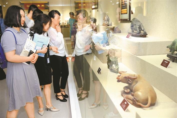 牛雕、牛繡、牛畫……厲有為無償捐贈(zèng)的1400余件牛藝術(shù)品來自不同的國家和地區(qū),形成于不同的歷史時(shí)期,包括玉石、金屬、陶瓷、竹木、刺繡、剪紙、書畫等各種材質(zhì)和工藝,具有重要的歷史文化價(jià)值和深刻的精神內(nèi)涵。比如,有一尊戰(zhàn)國銅牛的收藏品,造型生動(dòng)、設(shè)計(jì)精巧、工藝考究,牛脖子上雕刻的是長冠鳳圖案,牛背上雕刻的是太陽圖案,牛身上是龍鳳紋。