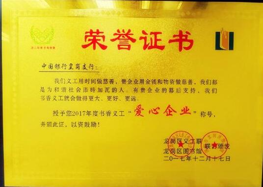 深圳新聞網(wǎng)訊 近日,深圳市龍崗區(qū)義工聯(lián)、龍崗圖書館書香義工2017年度總結(jié)大會(huì)在龍崗區(qū)文體中心召開。大會(huì)授予中國銀行深圳皇崗支行書香義工“愛心企業(yè)”稱號(hào),并聯(lián)合頒發(fā)榮譽(yù)證書。