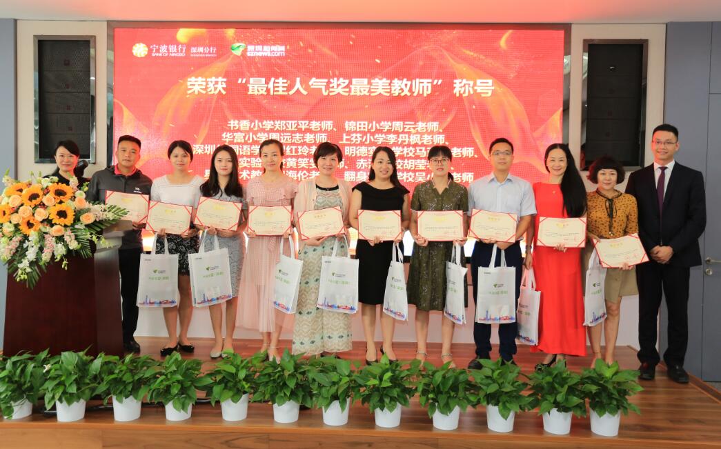 深圳新聞網(wǎng)訊 (記者朱琳江書劍)“國將興,必貴師而重傅?!崩蠋熥鳛椤白饚熤氐馈本竦谋憩F(xiàn)主體,傳道受業(yè)解惑,為社會發(fā)展不斷輸送著優(yōu)質(zhì)人才。2018年9月8日教師節(jié)前夕,由深圳新聞網(wǎng)、寧波銀行深圳分行聯(lián)合主辦的首屆“鵬城最美教師”風(fēng)采展示公益活動頒獎儀式在寧波銀行深圳分行隆重舉行?;顒幼?018年3月2日啟動以來,吸引了深圳市各中小學(xué)校的廣泛關(guān)注,經(jīng)過半年時間的尋找與舉薦,共有34位優(yōu)秀教師獲“鵬城最美教師”殊榮。其中有10位教師,通過網(wǎng)絡(luò)獻(xiàn)花獲得“最佳人氣獎最美教師”榮譽(yù)稱號。