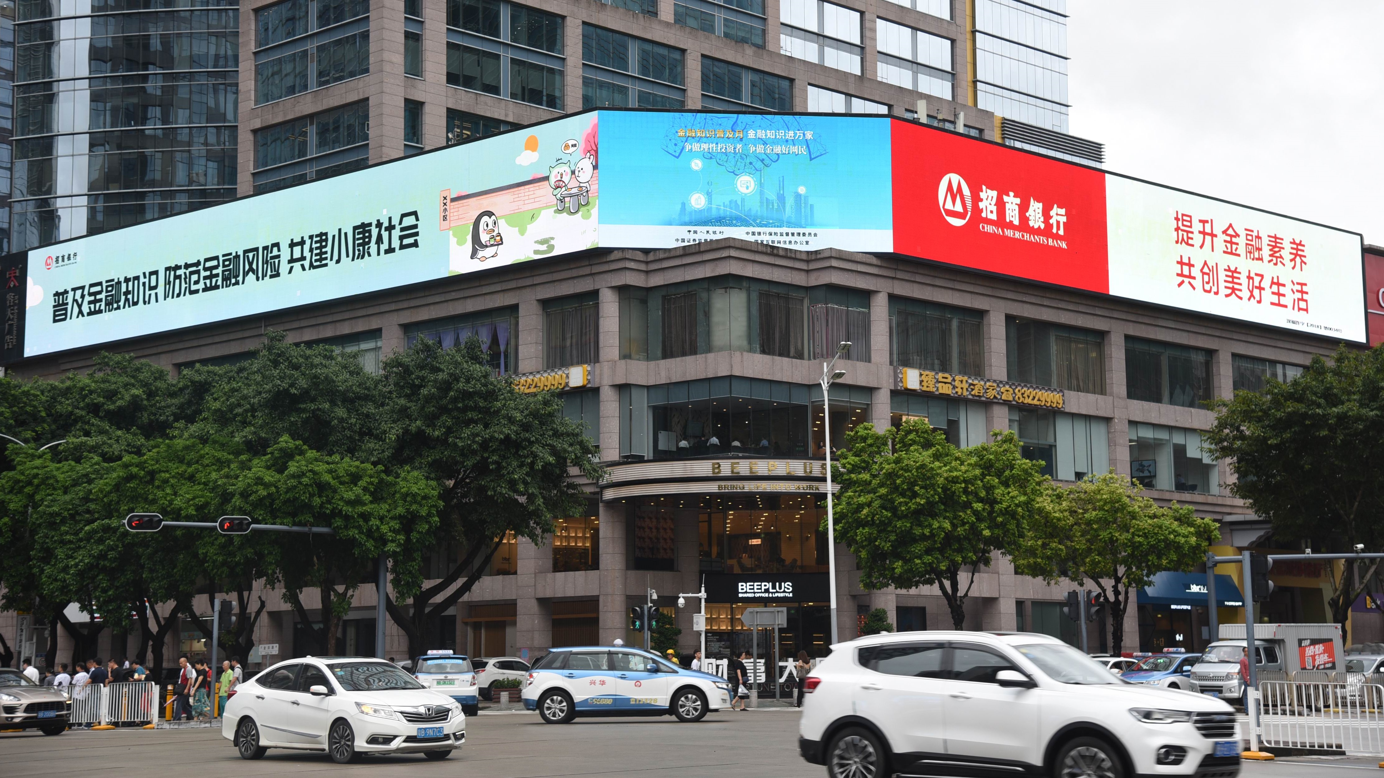 招商銀行除布局全轄網(wǎng)點營業(yè)廳滾動播放活動口號、總分行特色金融宣教片外,同時在財富大廈三面LED電子屏投放大型戶外廣告,進一步擴大宣教受眾面,消保品牌宣傳效果顯著。