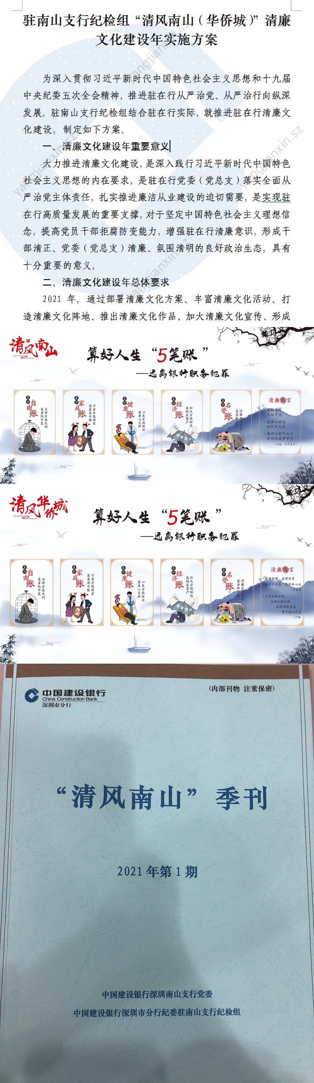 深圳新聞網(wǎng)6月9日訊 為充分發(fā)揮清廉文化的教育、激勵、凝聚、導(dǎo)向和約束作用,響應(yīng)深圳銀行業(yè)保險業(yè)清廉金融文化核心理念,積極培育厚德養(yǎng)廉的政治生態(tài),著力助推駐在行干部清正、黨委清廉、政治清明、生態(tài)清朗的清廉文化建設(shè),近日,建行深圳市分行駐南山支行紀(jì)檢組制定推出了《“清風(fēng)南山(華僑城)”清廉文化建設(shè)年實施方案》。該方案以“6講”為依托,明確清廉文化建設(shè)5大任務(wù),即:弘揚清廉價值理念、豐富清廉文化活動、打造清廉文化陣地、推出清廉文化作品、攜手清廉文化共建。