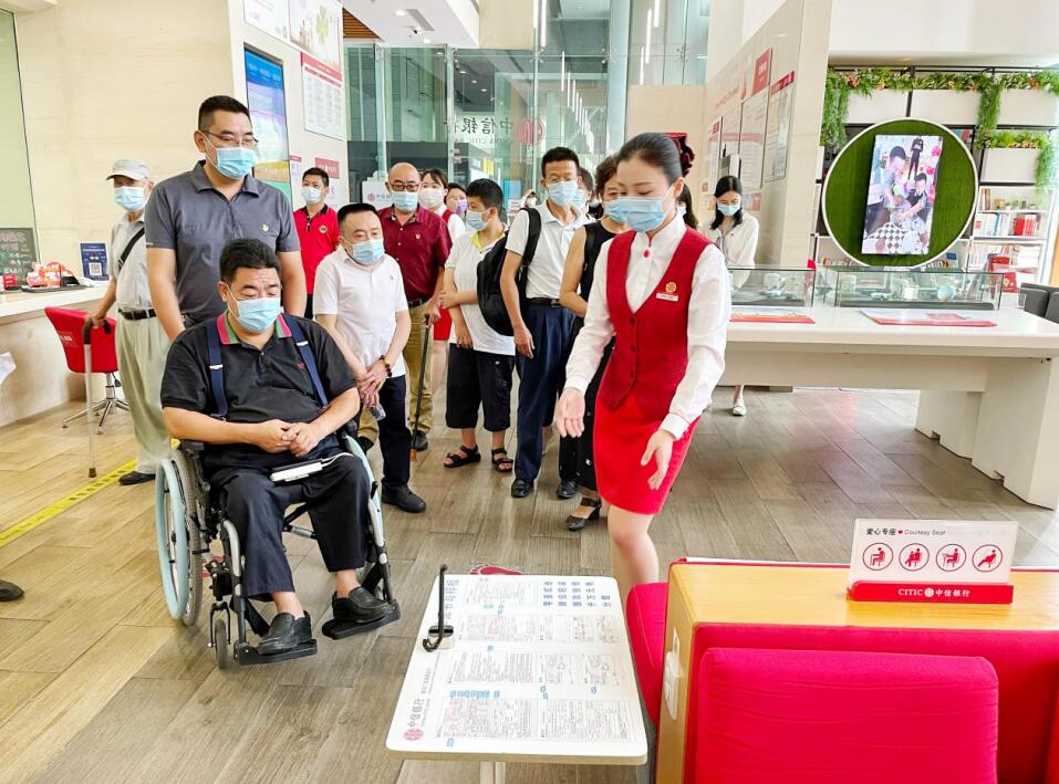 交流座談會結(jié)束后,全體黨員干部來到中信銀行深圳城市廣場旗艦支行現(xiàn)場體驗網(wǎng)點無障礙設(shè)施和服務(wù),支部黨員與障礙人士現(xiàn)場溝通交流,為改進無障礙服務(wù)提出有益建議。