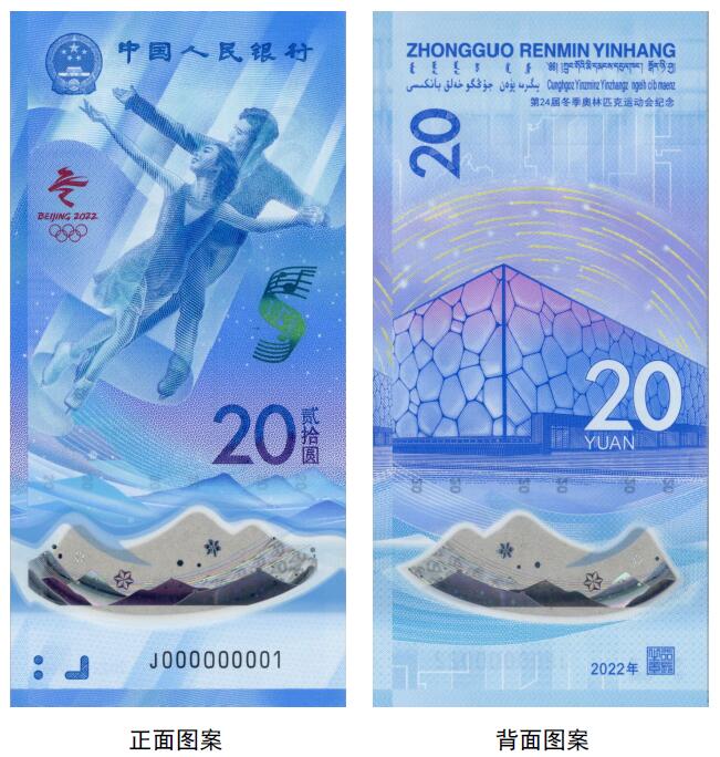 正面圖案:正面主景為花樣滑冰運(yùn)動(dòng)員圖案,上方為中華人民共和國(guó)國(guó)徽、“中國(guó)人民銀行”行名,左側(cè)為第24屆冬季奧林匹克運(yùn)動(dòng)會(huì)會(huì)徽,右側(cè)為光彩光變樂譜圖案、面額數(shù)字“20”與漢字“貳拾圓”,下方為動(dòng)感全息圖案、透明視窗、盲文面額標(biāo)記和冠字號(hào)碼。