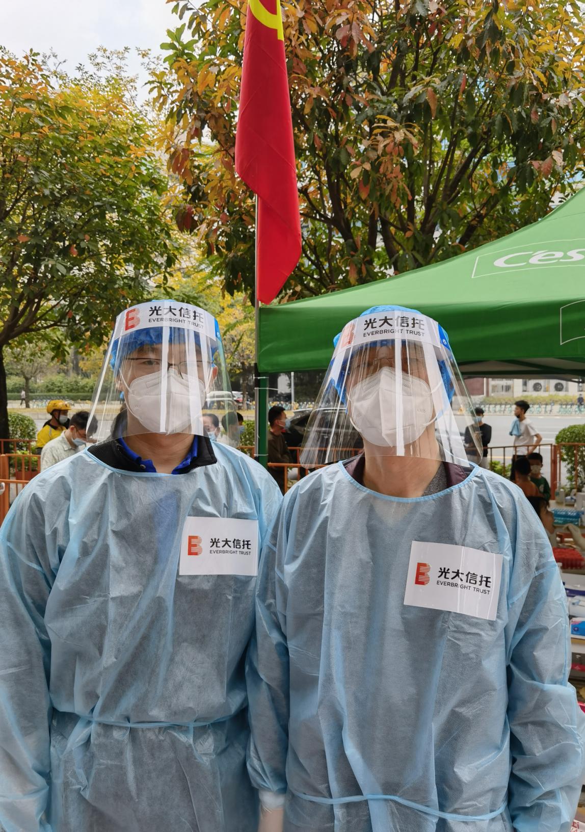 光大信托深圳區(qū)域黨支部在接到協(xié)同抗疫通知后,第一時(shí)間組織黨員和員工積極報(bào)名參與志愿服務(wù)。3月5日,恰逢毛澤東主席“向雷鋒同志學(xué)習(xí)”題詞的紀(jì)念日,光大信托公司風(fēng)險(xiǎn)總監(jiān)姚恒民同志以年近6旬的高齡,率先垂范的沖在一線,帶領(lǐng)深圳區(qū)域黨員同志們,投入福田區(qū)蓮花街道獅嶺社區(qū)的核酸檢測(cè)志愿服務(wù)工作,用實(shí)際行動(dòng)和赤誠(chéng)情懷書寫共產(chǎn)黨員的責(zé)任和擔(dān)當(dāng)。當(dāng)天天氣炎熱,太陽(yáng)暴曬下穿著防護(hù)服兩個(gè)小時(shí)工作下來(lái),全身已完全濕透,但他們以飽滿的激情、負(fù)責(zé)任的態(tài)度詮釋了一個(gè)共產(chǎn)黨員在黨旗下宣誓的誓言。光大信托的一位黨員同志說(shuō):“疫情就是命令,防控就是責(zé)任,崗位就是戰(zhàn)場(chǎng),每個(gè)服務(wù)點(diǎn)的黨旗就是一種信仰,每個(gè)黨員就是一面旗幟,每個(gè)黨支部就是一個(gè)堡壘,哪里有需要,哪里就有光大人的身影。”