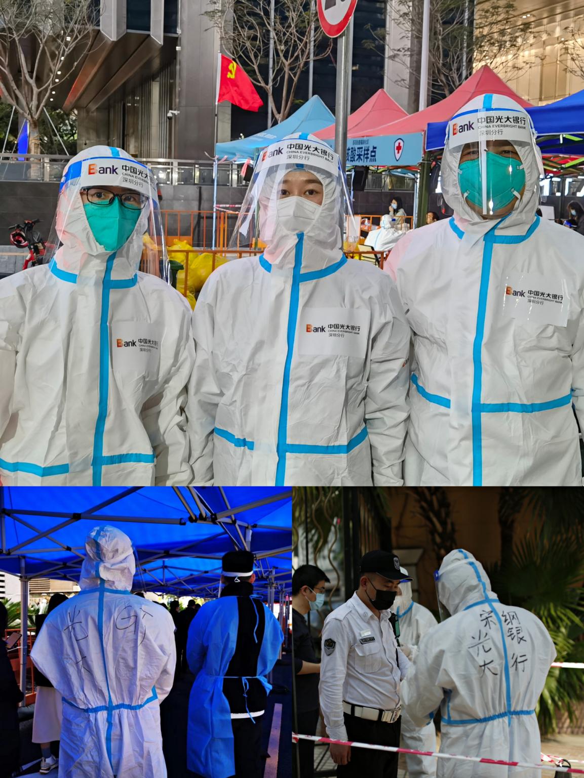在疫情防控的關(guān)鍵時(shí)期,深圳分行黨委堅(jiān)決貫徹落實(shí)當(dāng)?shù)卣姆揽匾螅中悬h委書記、行長(zhǎng)韓學(xué)智同志緊急召開(kāi)黨委會(huì)議,啟動(dòng)應(yīng)急預(yù)案,積極部署并投入疫情防控工作,確保日常營(yíng)運(yùn)和客戶服務(wù)等工作有序運(yùn)轉(zhuǎn)。在深圳福田區(qū)金融工作局的組織與號(hào)召下,分行黨委要求全體黨員干部發(fā)揮先鋒模范作用,主動(dòng)為社區(qū)疫情防控工作提供志愿服務(wù)。分行黨委委員們率先垂范,分頭帶領(lǐng)黨員干部奔赴社區(qū)慰問(wèn)抗戰(zhàn)一線工作人員,并犧牲周末休息時(shí)間深入社區(qū)核酸采樣點(diǎn),脫下西裝變身“大白”。深圳分行各黨支部和團(tuán)支部先后組織開(kāi)展各類志愿服務(wù)累計(jì)時(shí)長(zhǎng)超過(guò)100小時(shí),活躍在防疫抗疫一線的同志們?cè)谌ΡU蠌V大群眾金融服務(wù)需求的同時(shí),和醫(yī)護(hù)工作者一同守護(hù)著千家萬(wàn)戶。作為集團(tuán)駐深企業(yè)協(xié)同工作的牽頭單位,分行牽頭組建駐深企業(yè)志愿者先鋒隊(duì),緊急投身福田區(qū)抗擊疫情的各個(gè)戰(zhàn)線和各個(gè)角落,不分晝夜、不論疲倦、以實(shí)際行動(dòng)踐行初心、使命和擔(dān)當(dāng),弘揚(yáng)新時(shí)代共產(chǎn)黨人的奉獻(xiàn)精神?!叭绻皇怯H身體驗(yàn)志愿者服務(wù)工作,永遠(yuǎn)不知道抗疫人員的工作是如此辛苦!有多少人在負(fù)重前行才確保了深圳市民有序和安寧的生活。此刻很想擁抱可親可敬的你們,防護(hù)服雖然阻擋了我們的擁抱,但無(wú)法阻擋我們一起抗擊疫情的心?!币晃恢驹刚哌@樣記錄到。