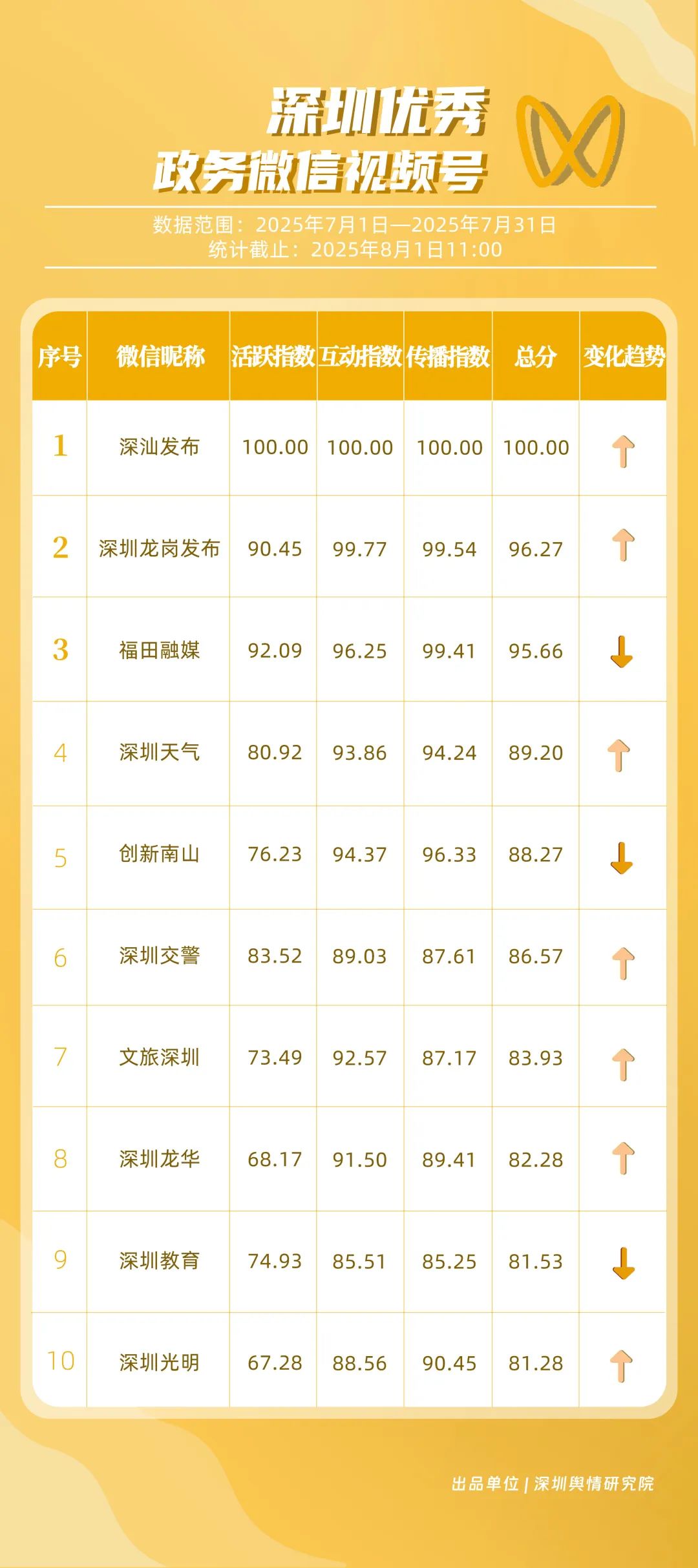 7月,獲得“深圳優(yōu)秀政務(wù)微信視頻號(hào)”稱號(hào)的是“深汕發(fā)布”“深圳龍崗發(fā)布”“福田融媒”“深圳天氣”“創(chuàng)新南山”“深圳交警”“文旅深圳”“深圳龍華”“深圳教育”“深圳光明”。其中,“深汕發(fā)布”持續(xù)輸出熱點(diǎn)內(nèi)容,收獲大量網(wǎng)民關(guān)注、互動(dòng),三項(xiàng)指標(biāo)均達(dá)滿分,位居榜首;“深圳龍崗發(fā)布”“福田融媒”緊隨其后,總分均超過(guò)95分,兩賬號(hào)通過(guò)多樣化的內(nèi)容呈現(xiàn),在活躍、互動(dòng)及傳播等方面均有出色表現(xiàn);“深圳天氣”“創(chuàng)新南山”“深圳交警”等賬號(hào)也獲得不錯(cuò)成績(jī),總分均在85分以上。上榜微信視頻號(hào)精準(zhǔn)把握平臺(tái)特性,高效傳遞了政務(wù)信息,更成為展現(xiàn)城市活力、拉近政府與民眾距離的重要窗口。