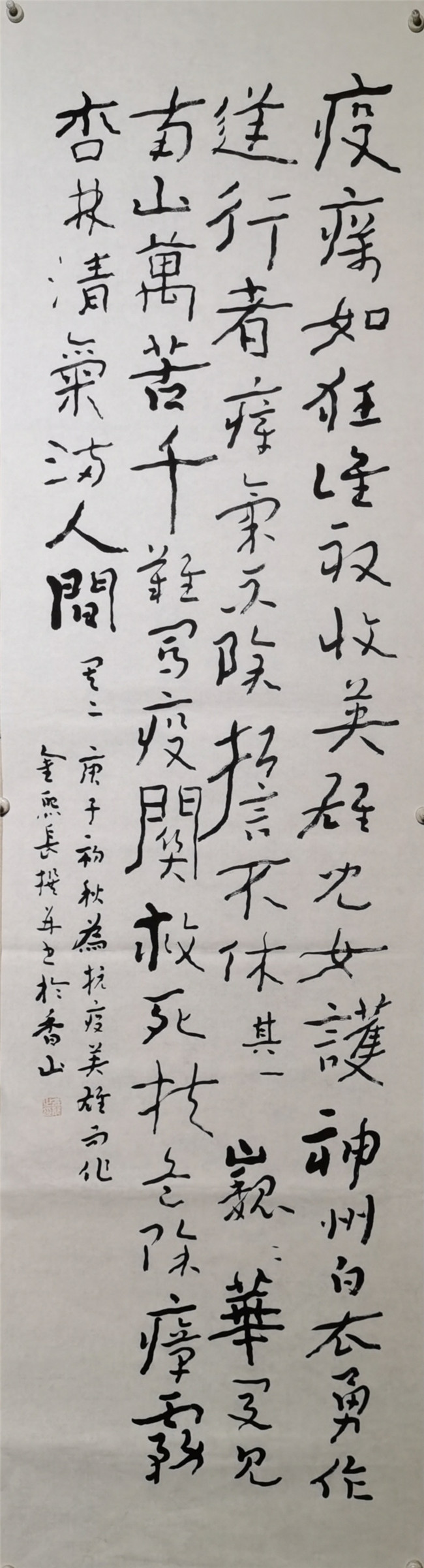 “筆筆有出處,字字有來歷。每個字用筆中鋒但結字奇古;書風野逸但又視覺大氣。正如創(chuàng)作者所言:中國是歷史悠久的文化大國,所以中國的文字書寫應該和大國文化相吻合的,以雄渾大氣為主要審美意識的表現(xiàn)手法方能展現(xiàn)中國精神。在技法上他還認為,秀媚易作雄渾難;小巧易作高簡難。故在本次《金體》創(chuàng)作上的審美觀念上,他仍以三個第一為導向,即“結體以正大老成為第一,用筆以簡重真切為第一,書風以高古偉岸為第一。