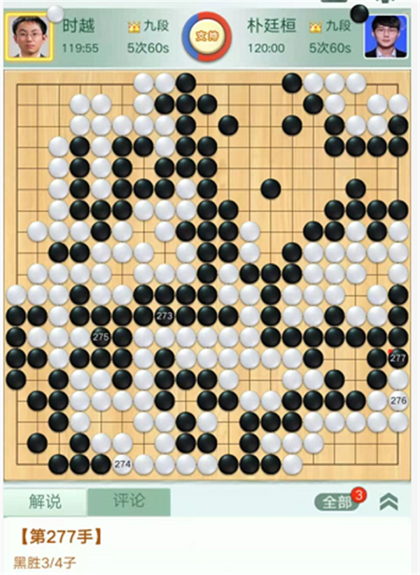 第二臺(tái)主將,由深圳隊(duì)時(shí)越九段執(zhí)白對(duì)陣成都隊(duì)韓國世界冠軍樸廷桓九段。開局下方雙方各有小失誤,局面均勢(shì)。之后左上黑棋行棋過分,白棋領(lǐng)先。白棋在黑右上角破空形成打劫,黑棋連走兩手分開右邊白棋進(jìn)行攻擊。白棋治孤中錯(cuò)失簡(jiǎn)明獲勝的下法,但是活出后依然稍好。緊接著白棋沒有選擇最大的官子,被黑棋走到后黑棋領(lǐng)先。之后黑棋官子收束滴水不漏,以最小差距3/4獲勝。時(shí)越執(zhí)白3/4子負(fù)樸廷桓。