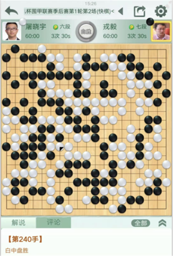 快棋臺由深圳隊戎毅七段執(zhí)黑對陣民生隊的屠曉宇六段。開局黑右上失誤失被白棋先手封住頭,虧損。中盤左邊作戰(zhàn)時候也應該中央出頭,實戰(zhàn)貪吃左邊白棋,被白棋外側(cè)滾打包收后劣勢擴大。之后黑棋左下隱患沒有及時自補,被白棋將左下角吃掉,局面已經(jīng)難以挽回。戎毅中盤負屠曉宇。