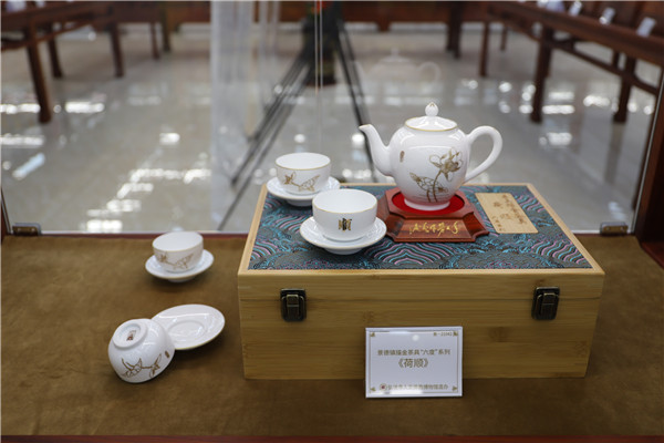 再就是印順大和尚倡意定制的帶有濃厚佛教色彩的生活用具,如紫砂、青瓷茶具套組《舍得》,景德鎮(zhèn)描金茶具“六度”系列《荷順》,均有以佛教意象蓮花為內(nèi)容的圖案或造型,讓人在使用時頓生清靜心、倍感佛法力,或可為信眾修行悟道助一臂之力。