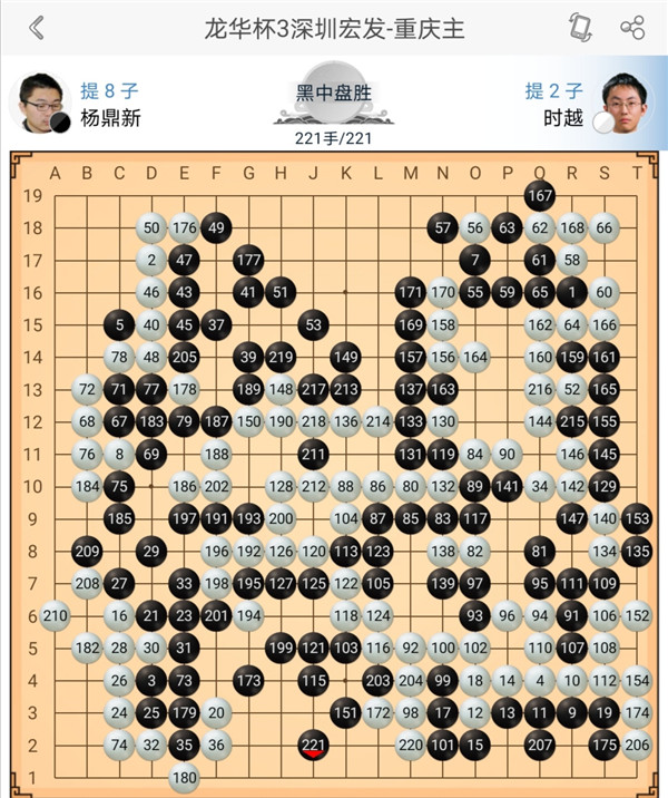 一臺戎毅執(zhí)黑對陣?yán)钴幒?,右上?zhàn)斗后黑棋稍有優(yōu)勢,之后黑棋沖擊中央白棋過分,應(yīng)該慢慢收官,白棋正確應(yīng)對,戰(zhàn)斗中便宜后獲得勝利。二臺主將時(shí)越執(zhí)白對陣等級分排名第二的楊鼎新,中盤黑棋打入右邊后形成亂戰(zhàn),白棋失誤比黑棋更多,戰(zhàn)斗結(jié)束進(jìn)入官子時(shí)黑勝勢。