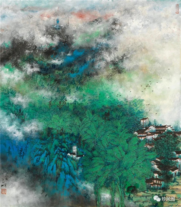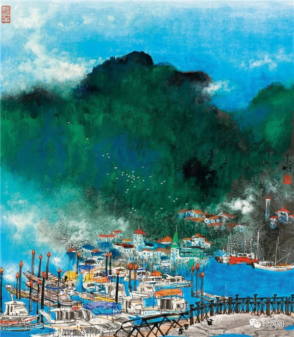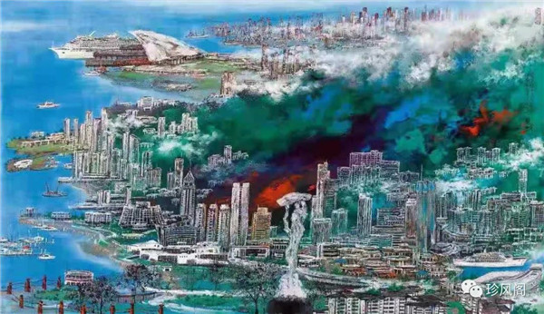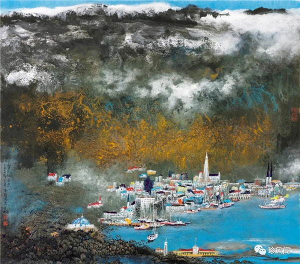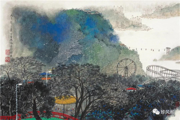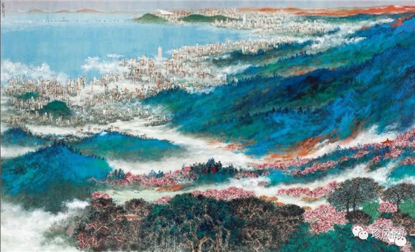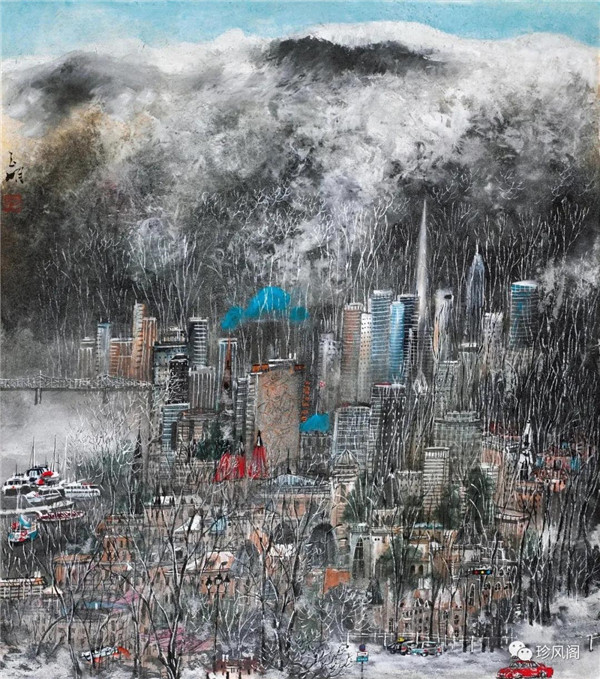 宋玉明從金陵畫派的新傳統(tǒng)跨越到城市表現(xiàn)的積彩拓墨畫法,既體現(xiàn)了現(xiàn)代化城市對于變革傳統(tǒng)的時(shí)代訴求,也體現(xiàn)了他移居深圳后這座新興城市文化對于他的深刻影響。畢竟,連續(xù)數(shù)屆的深圳水墨雙年展對于水墨在跨文化中重要作用與表現(xiàn)方法的突破,都給予他至深的思想開拓。這表明,城市山水畫已不單純是用中國畫表現(xiàn)城市的命題,而是其中能夠蘊(yùn)含多少城市文化觀念與城市審美的方法,宋玉明對于城市山水畫的探索,體現(xiàn)的正是這樣一種對城市現(xiàn)代文化的思想融合性。而不拘謹(jǐn)于城市一磚一石、一街一道、一房一樓的描繪,著眼于發(fā)揮水墨與彩墨表現(xiàn)的自由性,抑或體現(xiàn)了人性、自然與現(xiàn)代城市共同作用的現(xiàn)代生活方式與人文理想。的確,純粹用中國畫或水墨畫來探索城市的現(xiàn)代化景觀表現(xiàn),也許只是淺層次的審美需求;而只有當(dāng)把山水畫作為人與自然和諧統(tǒng)一的觀念表達(dá)植入城市現(xiàn)代化的審美訴求時(shí),城市山水畫才能真正凸顯出其深刻的美學(xué)價(jià)值。這正是我們從宋玉明的作品里能夠讀解到的他對于城市山水畫審美理想的一種勾畫。