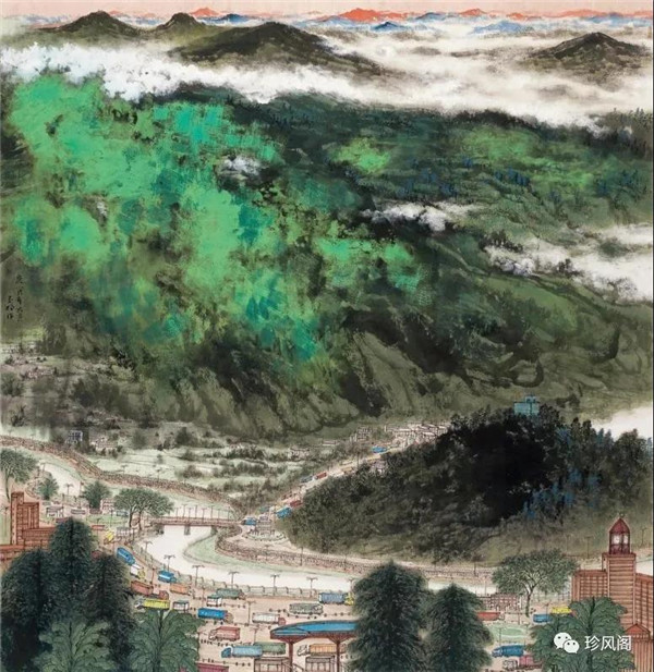 來自南京而定居于深圳的宋玉明,試圖將新金陵畫派表現(xiàn)現(xiàn)實(shí)的變革精神用于現(xiàn)代城市山水畫的探索上。作為新金陵畫派的第二代畫家,宋玉明直接承傳了宋文治表現(xiàn)現(xiàn)代太湖人居環(huán)境秀潤而精巧的家法,并將此種大山景加小民居的畫法轉(zhuǎn)用到深圳城市形態(tài)的表現(xiàn)上。這里,我們一方面可以看到深圳作為一個(gè)新興的現(xiàn)代城市借山而筑、注重自然環(huán)境在城市生態(tài)建設(shè)上的積極作用;另一方面,深圳這種與自然相統(tǒng)一的現(xiàn)代化城市建設(shè)理念,也為宋玉明進(jìn)行城市山水畫創(chuàng)作提供了完美的表現(xiàn)對象。在《深圳文錦渡》等作品里,我們看到了畫家巧妙地將城市現(xiàn)代建筑與自然山水融為一體的表現(xiàn)。這些畫作,大多以勾線渲染的方法表現(xiàn)遠(yuǎn)景中的商用或市政建筑設(shè)施,也因這些建筑被設(shè)置在中遠(yuǎn)景,不僅減少了建筑塑造的困窘,而且突出了這些人居建筑與自然相得益彰的和諧關(guān)系。這些畫作,從嚴(yán)格的意義上說,仍然是山水畫,而宋式小散鋒皴以及云煙雨霧的渲染,也為畫面增添了幽深、恬靜、高雅、平和的意趣與境界。這些畫作,讓我們所熟悉的城市從一個(gè)相對遙遠(yuǎn)的視角來觀看,既因距離產(chǎn)生了一種從未體驗(yàn)過的美感,也較好地體現(xiàn)了現(xiàn)代城市與自然占位的協(xié)調(diào)統(tǒng)一、舒適宜居的比例關(guān)系。