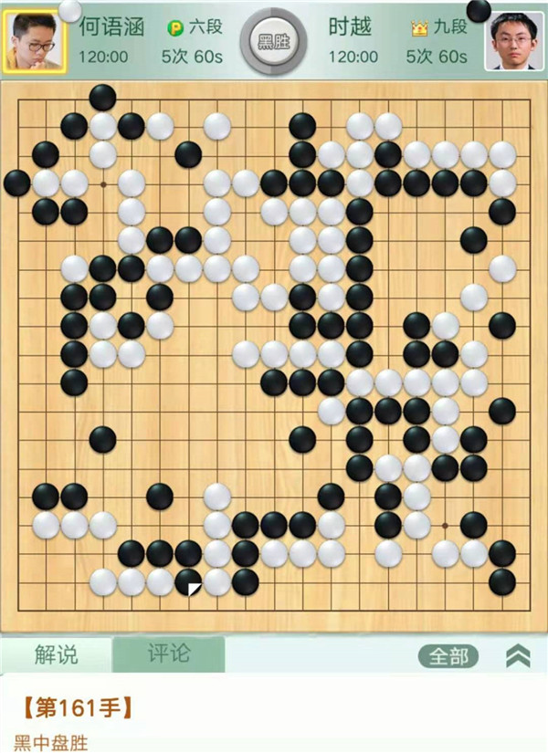 緊接著,一臺(tái)時(shí)越九段執(zhí)黑對(duì)何語涵六段干凈利落,時(shí)越在對(duì)局中充分發(fā)揮自身勢(shì)大力沉的棋風(fēng),以凌厲的屠龍刀法絕殺一條大龍,痛快淋漓地結(jié)束了戰(zhàn)斗。關(guān)鍵節(jié)點(diǎn)在中盤,黑棋對(duì)右邊白子簡(jiǎn)單吃住尾巴則優(yōu)勢(shì),實(shí)戰(zhàn)黑棋追求整體殺白,白棋應(yīng)對(duì)失誤大龍憤死,行棋161手。