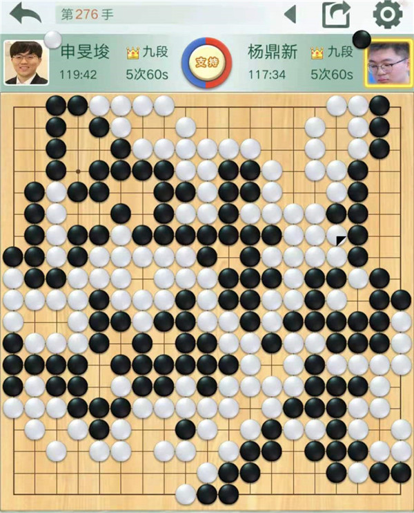 二臺(tái)主將申旻俊執(zhí)白對(duì)陣楊鼎新。右邊戰(zhàn)斗黑棋有所失誤,白棋局面大好。后來黑棋頑強(qiáng)追趕,最終還是白棋以最小優(yōu)勢(shì)1/4子獲勝。