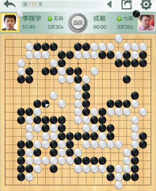 今日比賽中,三臺(tái)快棋戎毅執(zhí)黑對(duì)陣小將李翔宇,黑棋下方作戰(zhàn)失利早早進(jìn)入敗勢(shì)。后來白棋中央突然將自己大龍走死,黑棋幸運(yùn)獲勝,行棋171手。
