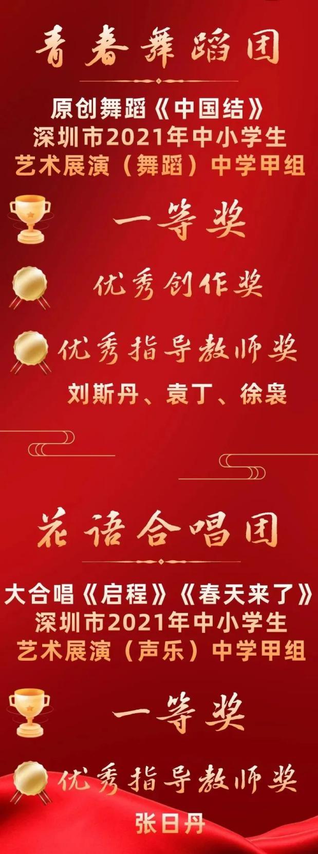 二實青春舞蹈團以原創(chuàng)作品《中國結(jié)》在全市各區(qū)以及市直屬學校選拔出來的37個節(jié)目中脫穎而出,獲得全場最高分!接下來,青春舞蹈團將代表深圳市參加省賽,有望沖擊全國決賽!此外,二實花語合唱團也憑借大合唱《啟程》《春天來了》榮獲深圳市2021年中小學藝術(shù)展演(聲樂)中學甲組一等獎。劉斯丹、袁丁、徐裊、張日丹等老師榮獲優(yōu)秀指導老師獎。