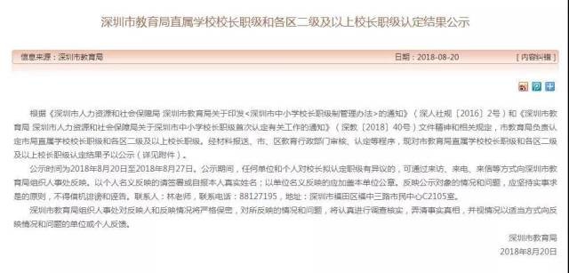 備受關(guān)注的深圳校長職級制改革有了新進展。8月20日,深圳市教育局官網(wǎng)對直屬學(xué)校校長職級和各區(qū)二級及以上校長職級認定結(jié)果進行公示,共有371人。據(jù)了解,這是該項改革啟動后首次集中公示。各區(qū)三級及以下正、副校長的職級,由區(qū)評定委員會負責(zé)評定,目前也都在各區(qū)教育局官網(wǎng)公示中。根據(jù)統(tǒng)計,此次深圳全市評定職級的正、副校長共1297人。