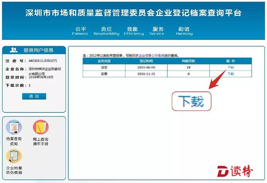 驗證成功后,電腦顯示進入查詢頁面,顯示與登錄人有關的企業(yè)名稱。點擊要查詢檔案的企業(yè)名稱,顯示列出“企業(yè)登記檔案”。