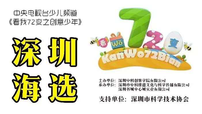 9月15日(本周六),央視“看我72變”欄目組將聯(lián)合深圳市科學(xué)技術(shù)協(xié)會、深圳市中心書城、中科創(chuàng)造力實驗室,在中心書城大臺階舉辦第10屆“看我72變”之創(chuàng)意少年(深圳賽區(qū))的海選。只要你的孩子有創(chuàng)意有想法,都可以來到中心書城參加海選,發(fā)揮自我創(chuàng)意,結(jié)識新朋友。征集節(jié)目類型包括但不限于藝術(shù)創(chuàng)意表演:舞蹈、音樂、書法、輪滑、體育類等,科技創(chuàng)意:科技作品展示等,優(yōu)勝者將有機(jī)會登陸央視舞臺參加節(jié)目錄制。