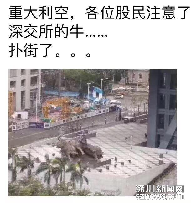 深圳新聞網(wǎng)9月18日訊(記者 張玲 實習(xí)生歐陽子瑜 張林羽 陸宇)關(guān)于“山竹”的各種段子特別多,博君一笑,未必是真。記者18日發(fā)現(xiàn),有一張像素極低的圖在網(wǎng)上流傳,照片中一頭牛雕塑臥倒在地,配文是:重大利空,各位股民注意了,深交所的牛,撲街了……