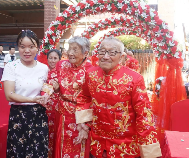 當(dāng)日下午,伴隨著婚禮進(jìn)行曲響起,金婚老年夫婦身穿中國傳統(tǒng)服飾,緩緩走上紅毯,通過拱形花門,步入慶典會場。他們微微顫抖的手緊緊握在一起,早已爬滿皺紋的臉上笑開了花?,F(xiàn)場頓時洋溢起幸福的味道和甜蜜的氣息。