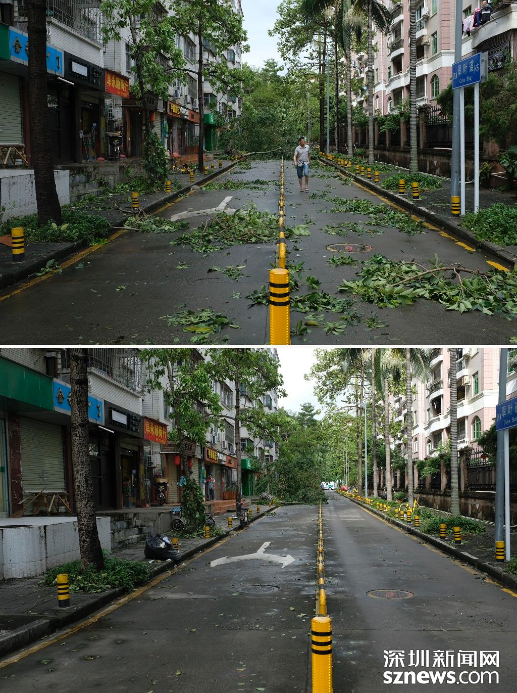 商報(bào)東二路翠葉道清理前后對(duì)比(上圖:2018年9月17日,臺(tái)風(fēng)過(guò)后,倒塌的樹(shù)木堵住路面,無(wú)法通行。下圖 2018年9月18日早上,樹(shù)木被清掃了一半,右車(chē)道可以通車(chē))