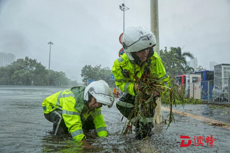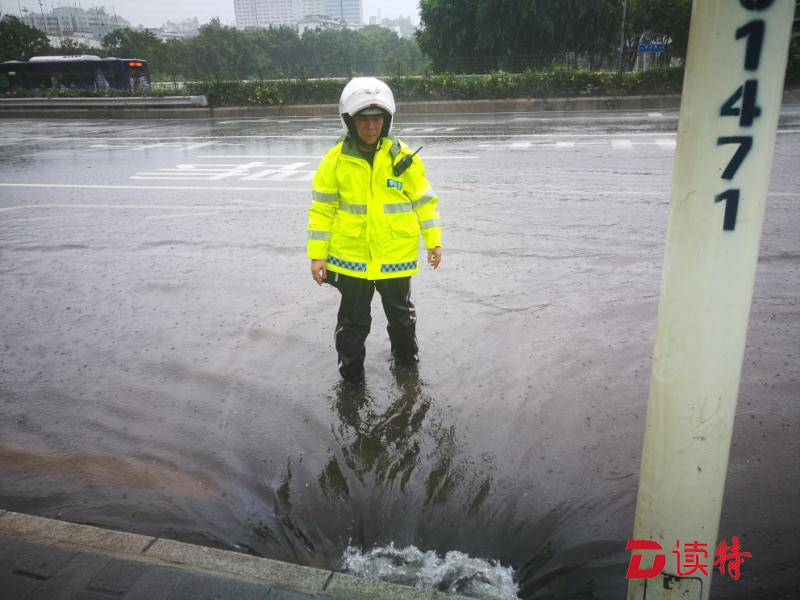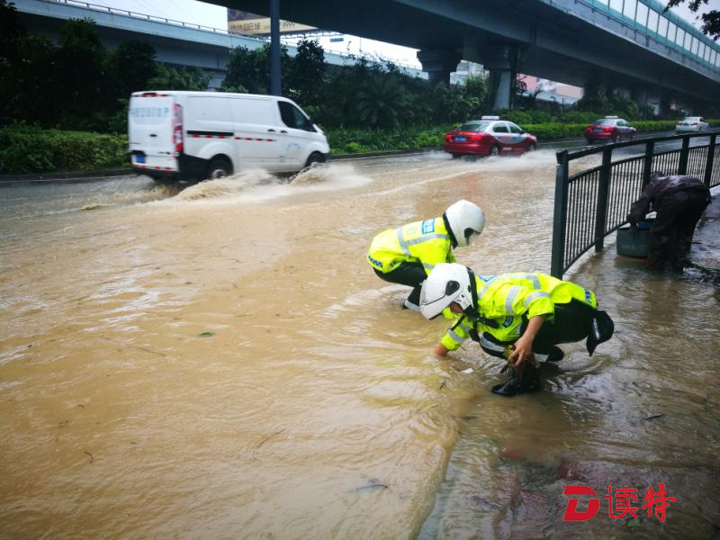 但是,眼前的情況,他們無法視而不見。深鹽二通道下方,羅沙路羅湖公安分局調(diào)頭口處,當(dāng)艾力軍經(jīng)過這里時發(fā)現(xiàn)由于地勢低洼路面已經(jīng)嚴重積水,他們馬上停下車,疏通下水道。一行人在風(fēng)雨中走進機動車道,沿著路邊只能用手在積水中摸索排水口的位置,將阻塞入水口的樹枝樹葉掏出來。但風(fēng)急雨驟,道路積水水位剛下降一點,剛被清理的下水道又堵樹葉、樹枝等雜物堵上,他們只好不斷地進行著重復(fù)的動作。而此時,臺風(fēng)“山竹”距離深圳接近130公里,羅湖片區(qū)測得最大陣風(fēng)達16級。