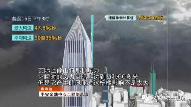 截至16日下午3時,監(jiān)測到臺風‘山竹’的最大風速為47.8米/秒,平均風速為30至35米/秒。根據(jù)監(jiān)測數(shù)據(jù)推算,塔頂擺幅不超過單側(cè)30厘米,也就是說還不到設計值的50%。