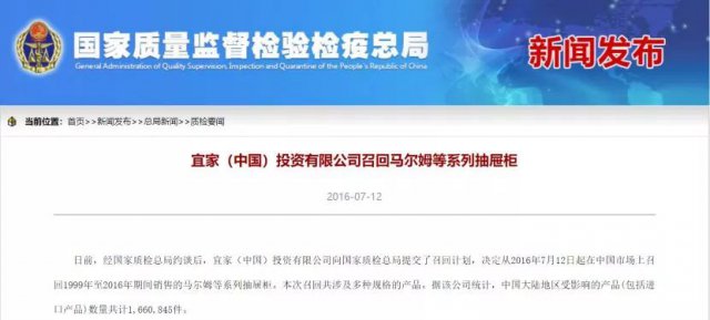 2016年7月12日,國家質(zhì)檢總局官網(wǎng)宣布,經(jīng)約談后,宜家(中國)投資有限公司向國家質(zhì)檢總局提交了召回計劃,決定在中國市場上召回1999年至2016年期間銷售的馬爾姆等系列抽屜柜。本次召回中國大陸地區(qū)受影響的產(chǎn)品 (包括進口產(chǎn)品 )數(shù)量共166萬件。