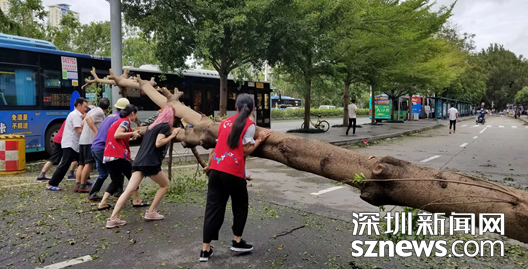 9月16日上午,蛇口街道南水社區(qū)黨委書記、婦聯(lián)主席李淑文,冒著可能被樹倒塌木砸傷的危險,浸泡在沒膝的雨水中幾個小時清理臺風刮落路面的樹枝,讓來往車輛順利通行。