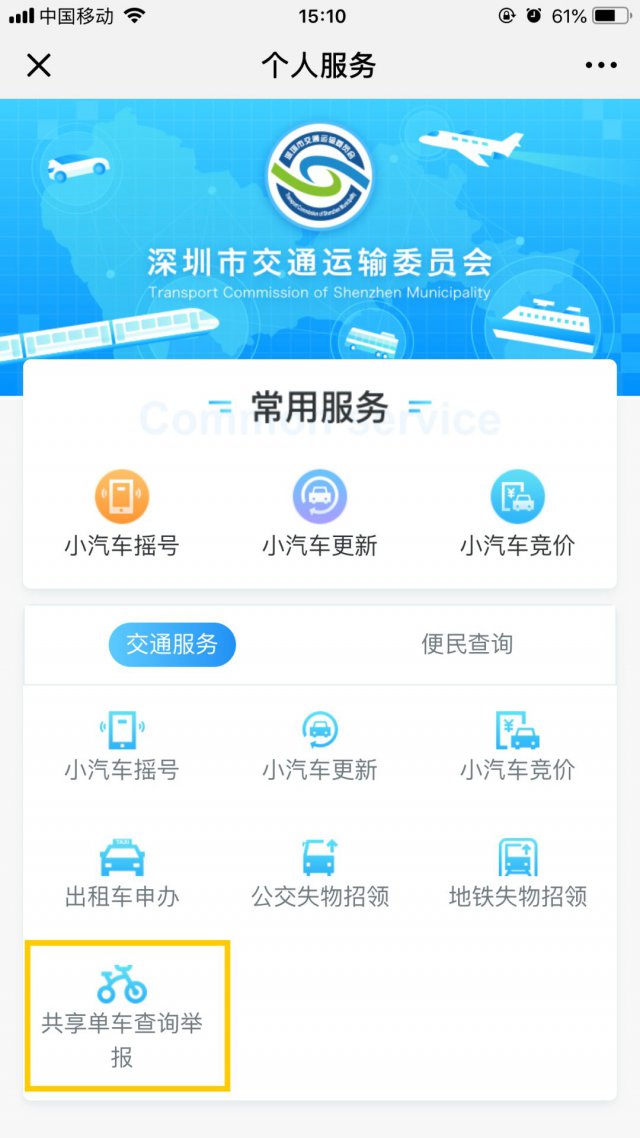 關(guān)注并進入「深圳交委」微信公眾號;點擊「便民服務」菜單欄 &;在「交通服務」分類下就可以找到「共享單車查詢舉報」功能了!