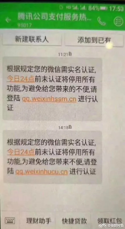 兩條短信中的實名認證網(wǎng)址不一樣!
