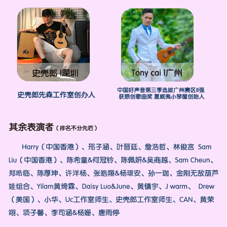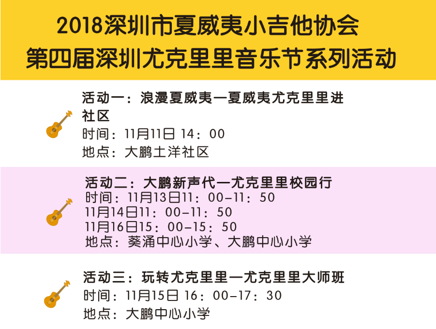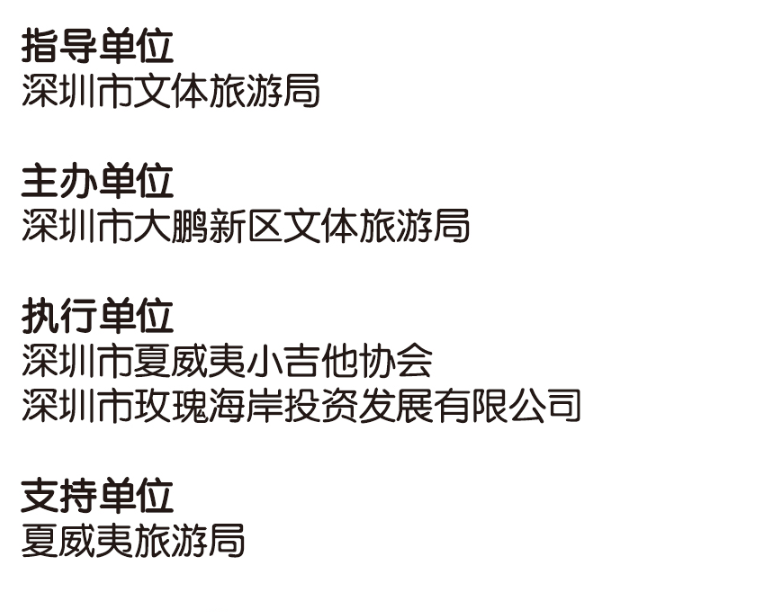 其中全民參與嘉年華音樂會(huì)11月17日的將會(huì)在深圳市玫瑰海岸沙灘舉辦,有深圳、香港(中國)、臺灣(中國)、美國、日本、廣州、中山、珠海等地的嘉賓和愛好者近50組表演者帶來4小時(shí)尤克里里盛會(huì),表演者年齡跨度更是從5歲到60歲。嘉年華現(xiàn)場除了尤克里里音樂會(huì),還將有Moana夏威夷呼拉舞風(fēng)情體驗(yàn),中國臺灣尤克里里協(xié)會(huì)會(huì)長陳建廷新書《兒童尤克里里英文暢游》深圳首發(fā),中國臺灣尤克里里世界大賽冠軍蔡皓怡原創(chuàng)專輯《航海日志》深圳首發(fā),以及美國尤克里里音樂家、藝術(shù)家新專輯《粉色海豚》尤克里里專輯中國大陸首發(fā)。