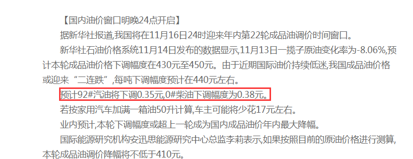 16日晚24時,成品油迎來11月第二次調(diào)價