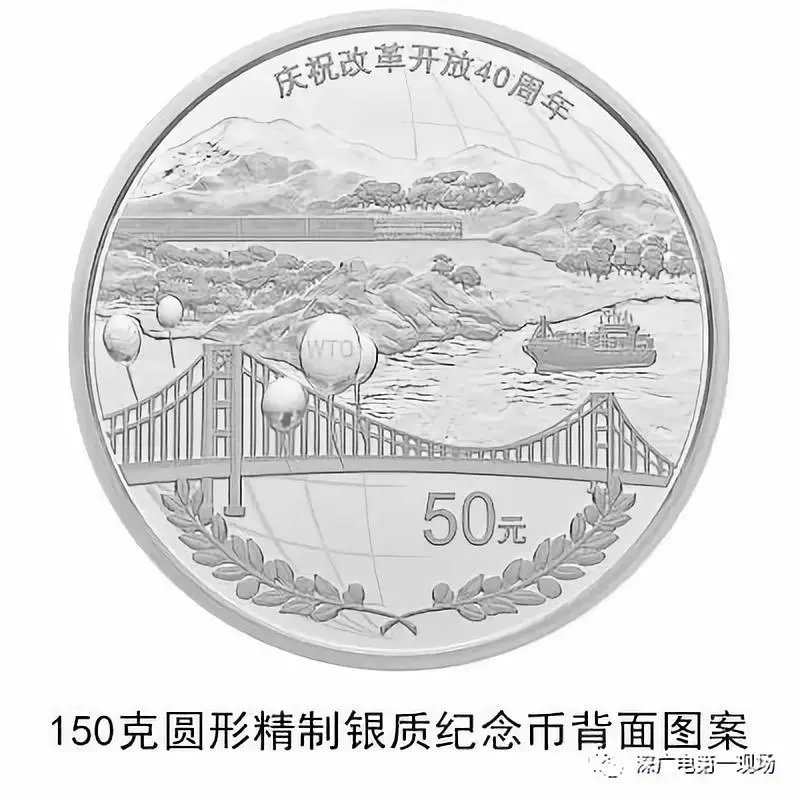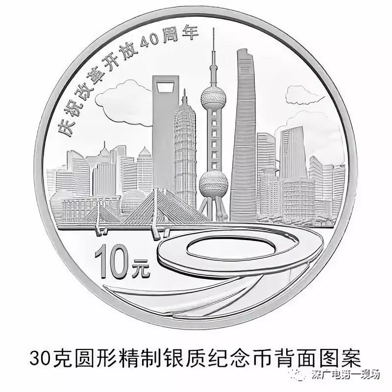 30克圓形銀質(zhì)紀念幣背面圖案之三為上海浦東標志性建筑及南浦大橋、黃浦江等組合設(shè)計,并刊“慶祝改革開放40周年”字樣及面額。