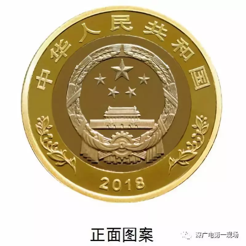 雙色銅合金紀念幣正面圖案為國徽,國徽上方刊“中華人民共和國”國名,下方刊年號“2018”字樣,左右兩側(cè)為果實圖案。
