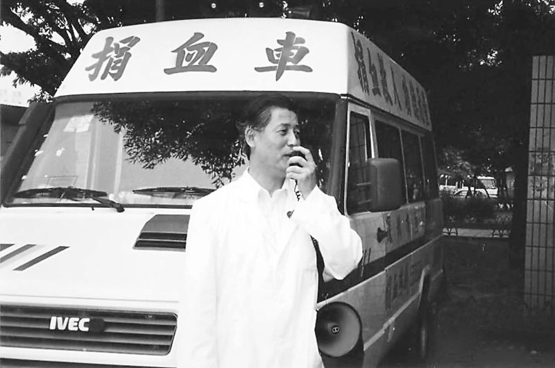 1995年5月7日,捐血車(chē)第一天開(kāi)上街頭,血站老站長(zhǎng)楊春森拿著擴(kuò)音器大嗽叭向市民宣傳。 余海蓉 攝