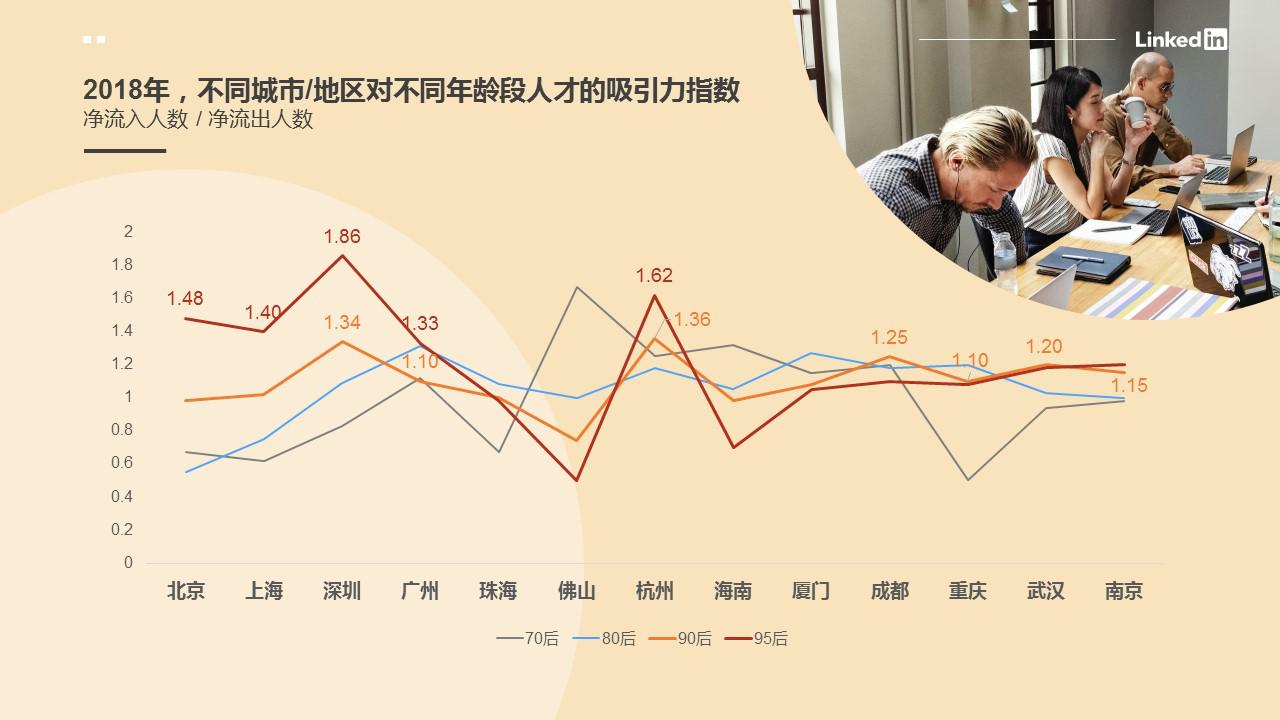 在2018年對95后最具吸引力的前五名城市分別為:深圳、杭州、北京、上海和廣州。但到了90后,當(dāng)經(jīng)歷了第一份工作、積累了一定工作經(jīng)驗后,一線城市的吸引力開始下降:深圳、廣州排名尚且靠前,但北京、上海的吸引力已顯著下降,一批新一線城市取而代之成為了年輕人的下一個選擇。2018年,90后年輕人的職場第二步普遍開始于杭州、深圳、成都、武漢、南京、廣州、重慶等城市。