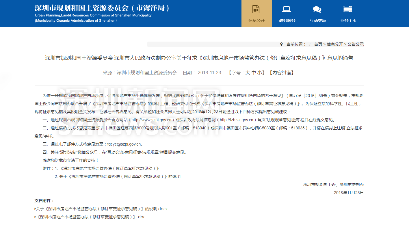 深圳新聞網(wǎng)11月24日訊(記者 張玲)深圳市房地產(chǎn)行業(yè)將取消年檢制度,改為年報(bào)制度、銷(xiāo)售價(jià)格以數(shù)據(jù)共享方式備案、預(yù)售條件為完成地面以上三分之一層數(shù)、房地產(chǎn)開(kāi)發(fā)企業(yè)不得拒絕購(gòu)房人使用住房公積金貸款、人均租住建筑面積不得低于6㎡……實(shí)施已有8年的《深圳市委房地產(chǎn)市場(chǎng)監(jiān)管辦法》要修訂了,11月23日,深圳市人民政府法制辦和深圳市規(guī)土委同時(shí)在官網(wǎng)發(fā)布通告,就修訂后的草案征求社會(huì)公眾意見(jiàn)。