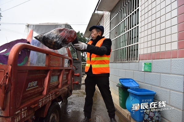 (龍?zhí)拼灞崋T楊少強正挨家挨戶上門收取生活垃圾。)