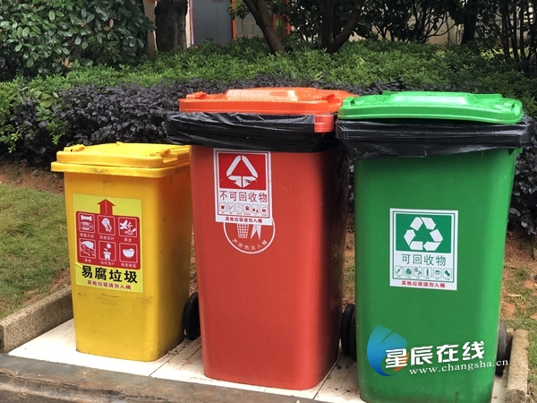 (潤和紫郡小區(qū)道路邊顯眼的三色垃圾桶。)