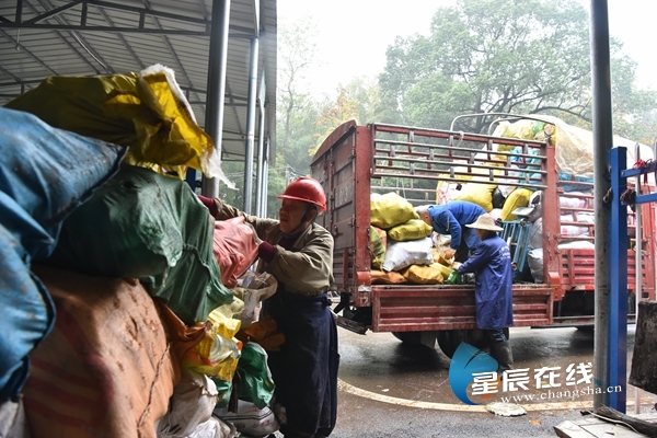 (白箬鋪鎮(zhèn)分揀回收總站的工作人員正對村里轉(zhuǎn)運來的垃圾進行分類。)